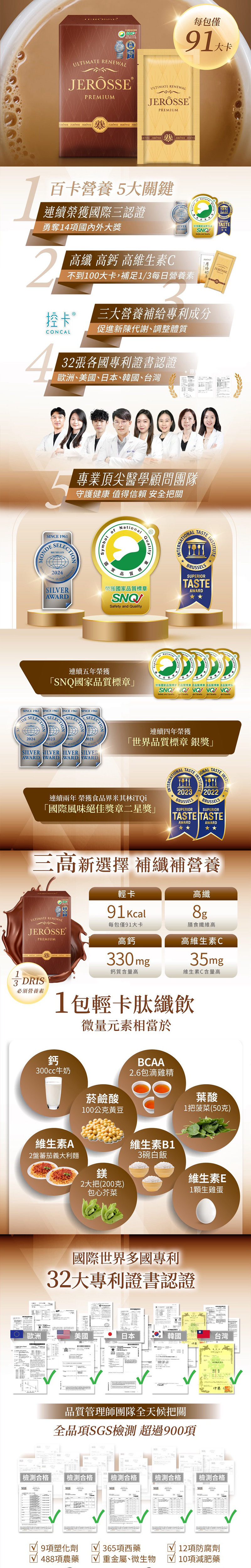 婕樂纖輕卡肽纖飲獲得世界品質標章、國際風味評鑑-風味絕佳獎章、國家品質標章SNQ認證